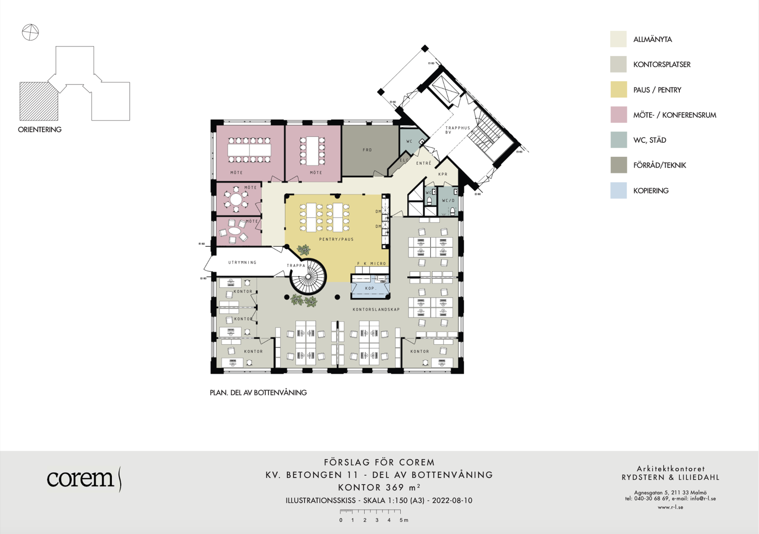 Här erbjuds en fräsch lokal på entréplan med nya golv, nytt kök och ett härligt ljusinsläpp då lokalen har fönster i fyra väderstreck. Lokalen är inflyttningsklar och tillträde kan därför ges inom kort. Lokalen är uppdelad i fina kontorsrum längs fasaden. Hjärtat i lokalen består av det gemensamma köket. Här finns bra med mötesrum och flertalet fina hörnrum för flera medarbetare eller olika avdelningar. Lokalen har ett antal pelare som är charmiga och kan nyttjas till spännande färgsättning eller klättervägg för växtinredning. Fin möjlighet till egen reception i anslutning till entrén.