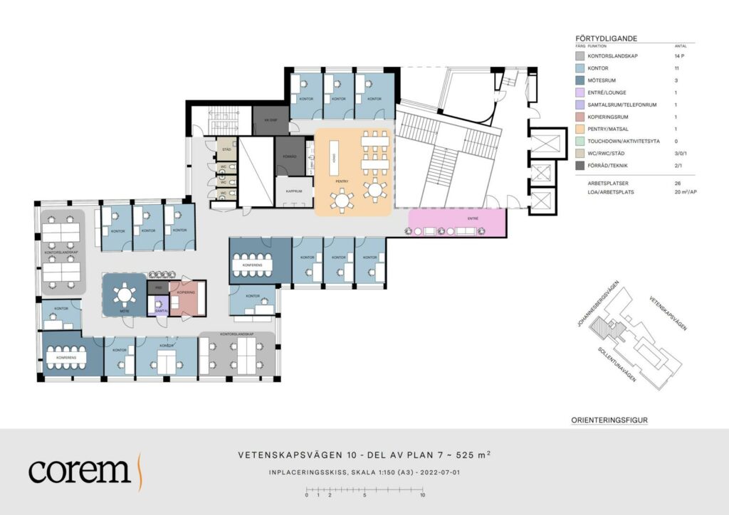 Välkommen till Vetenskapsvägen 10. Längst upp i huset ligger den här mycket fina lokalen i gott skick med ljus och öppen utsikt runt om. Mycket trevlig och rymligt kontor om 525 kvm i en fastighet full av service. Kontorslokalen är fördelad mellan öppna landskap och mindre kontor, här finns även bra med lagerutrymmen. Välkomnande entré i pentry i kombination med pentry och lounge. På samma plan finns tillgång till en gemensam terrass där man kan avnjuta sin lunch eller ordna kundevent.