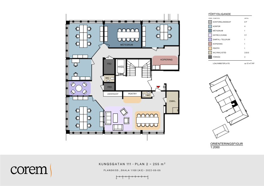 Välkommen till Kungsgatan 111 och en medelstor lokal på plan två. I entrén möts du av ett stort och ljust allrum, vilket passar som både lunchrum och arbetsyta. Kontoret består i övrigt av fyra enskilda rum och gemensamma ytor. Lokalen har genomgående parkettgolv och köket är nyrenoverat med vita luckor. Här finns också wc med dusch i kakel och klinker.