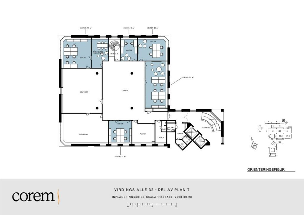 Välkommen till Virdings allé 32B. På översta våningen finns möjligheten att hyra ett ljust och fint kontor med härlig utsikt. Här disponerar ni flera mindre kontorsrum, pentry och lounge.